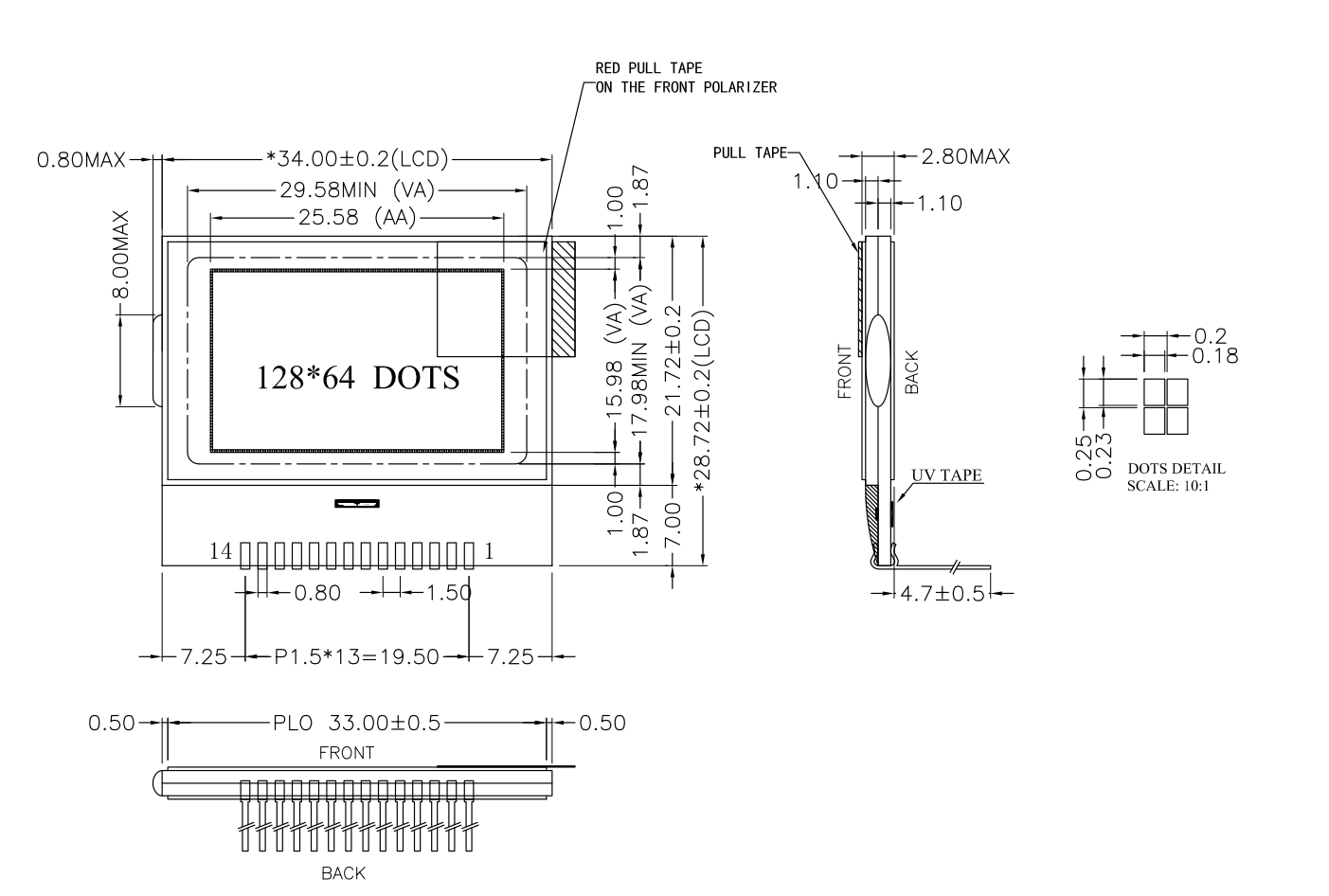Module dimension of BO12864H1 is (34 x 28.72) mm and viewing area is (70.7 x 38.8) mm.